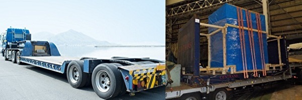 国内陸上運送 ● 通常トラックによる一般雑貨の輸送 ● ユニック車両による工事現場への輸送 ● ドライコンテナはじめ、タンクコンテナ、リーファーコンテナなどの輸送 ● 特殊低床トレーラーによる高さがオーバーした特殊貨物の輸送